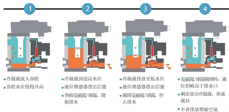 機械式無耗氣排水器(Mechanical zero air-loss drain),純機械結構無需電源供應,僅在需要排水時才打開。內部浮球或活塞控制閥門動作,當冷凝水達到一定液位時,自動開啟排水閥排水,排完後自動關閉且不會排氣。